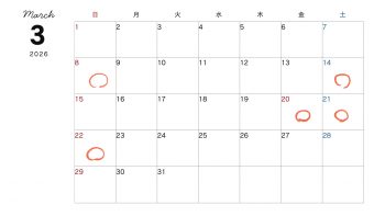 赤丸以外の日でも個人的に休む時がありますが、基本的に事務所に人がいるであろうカレンダーとなっています。