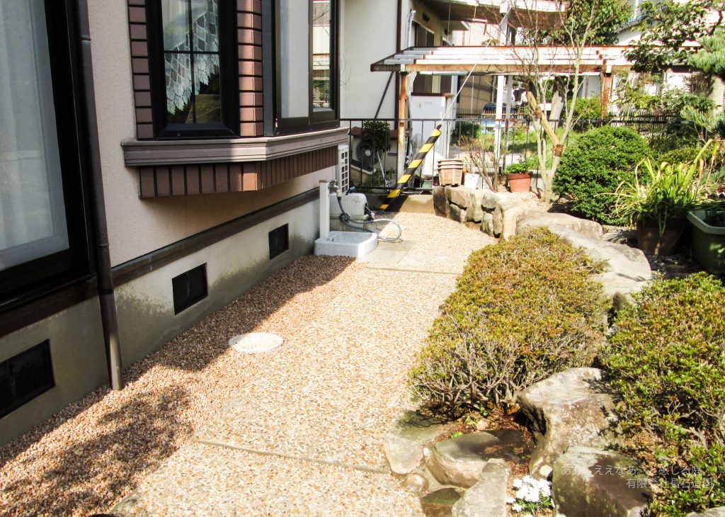 建物の際には洗い出しで使用した砂利と同じものを防草シートの上に敷き防草対策もしました。