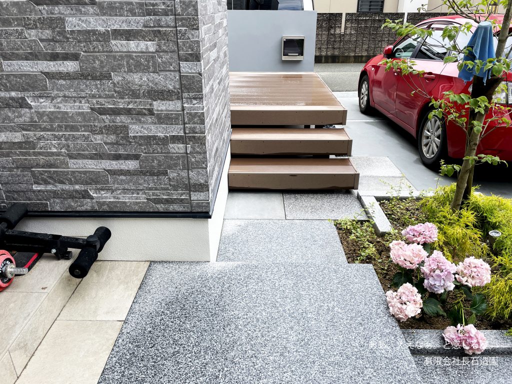 浮遊ステップちまたではタイルなどを張ってしあげてあるのをよく見かける浮遊ステップですが、こちらでは御影石を特注しステップとして施工。