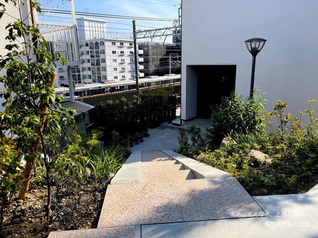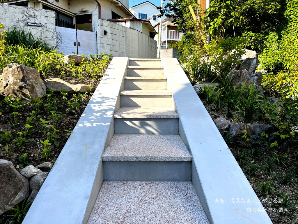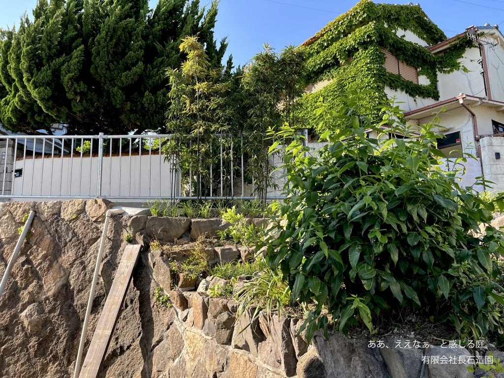 もともとあった石積みと据えなおされた石、植栽が心地よいです。