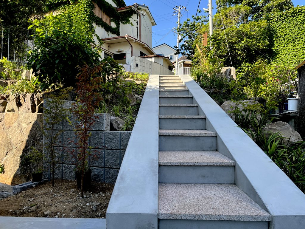 石を据え付けつつ自然に土留めを行い、植栽も入れてええ感じに。