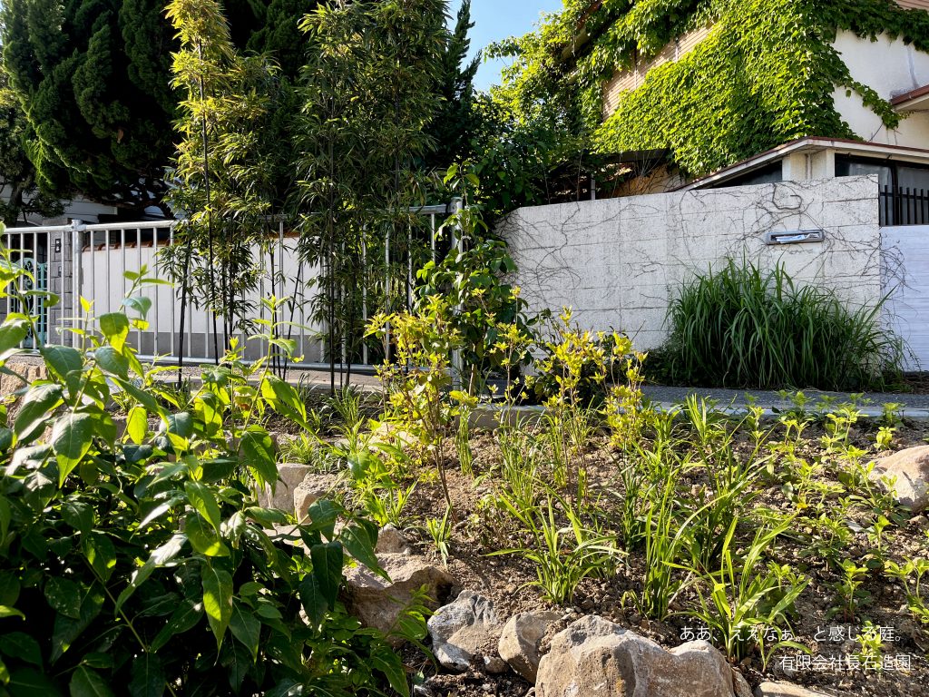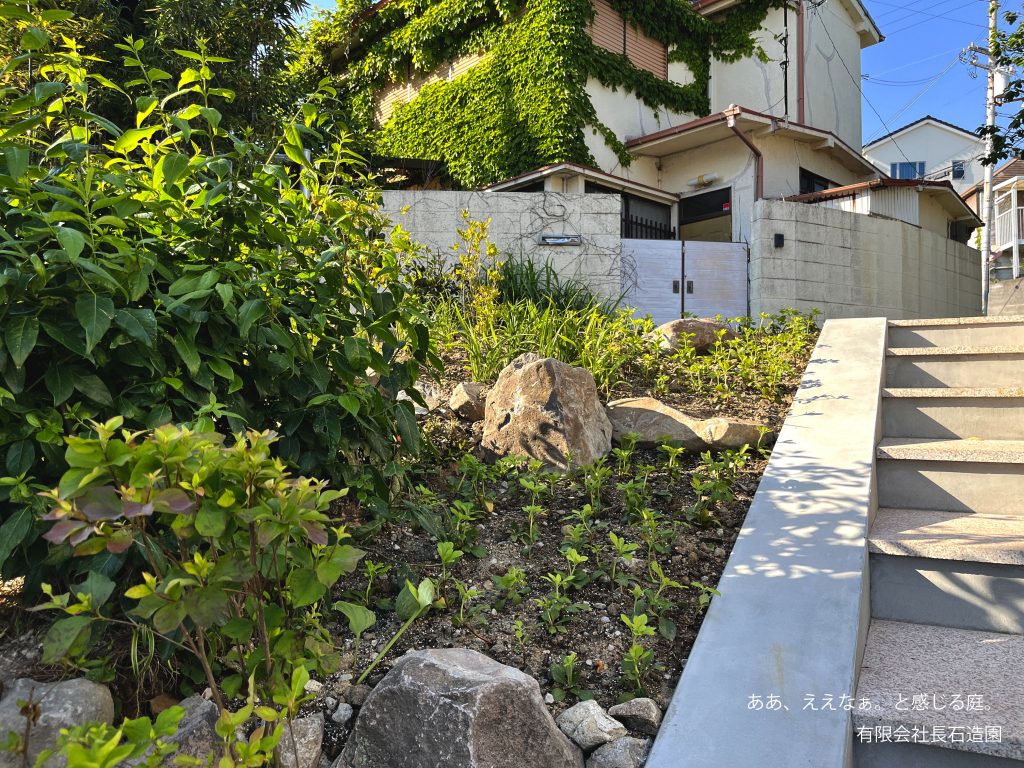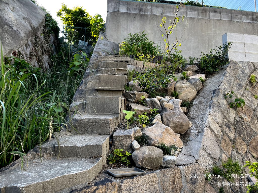 こちらの法面も雑草を処理し、石を自然な形で据え付けなおし、そこへ植栽を入れて景色を造りなおしました。
