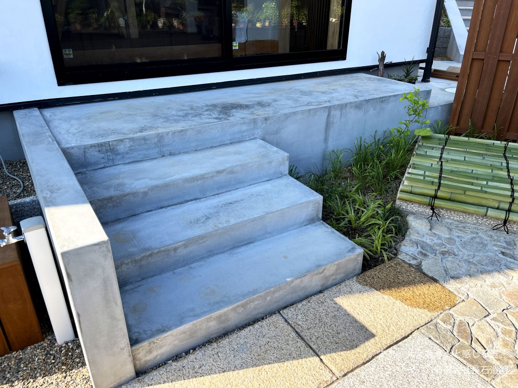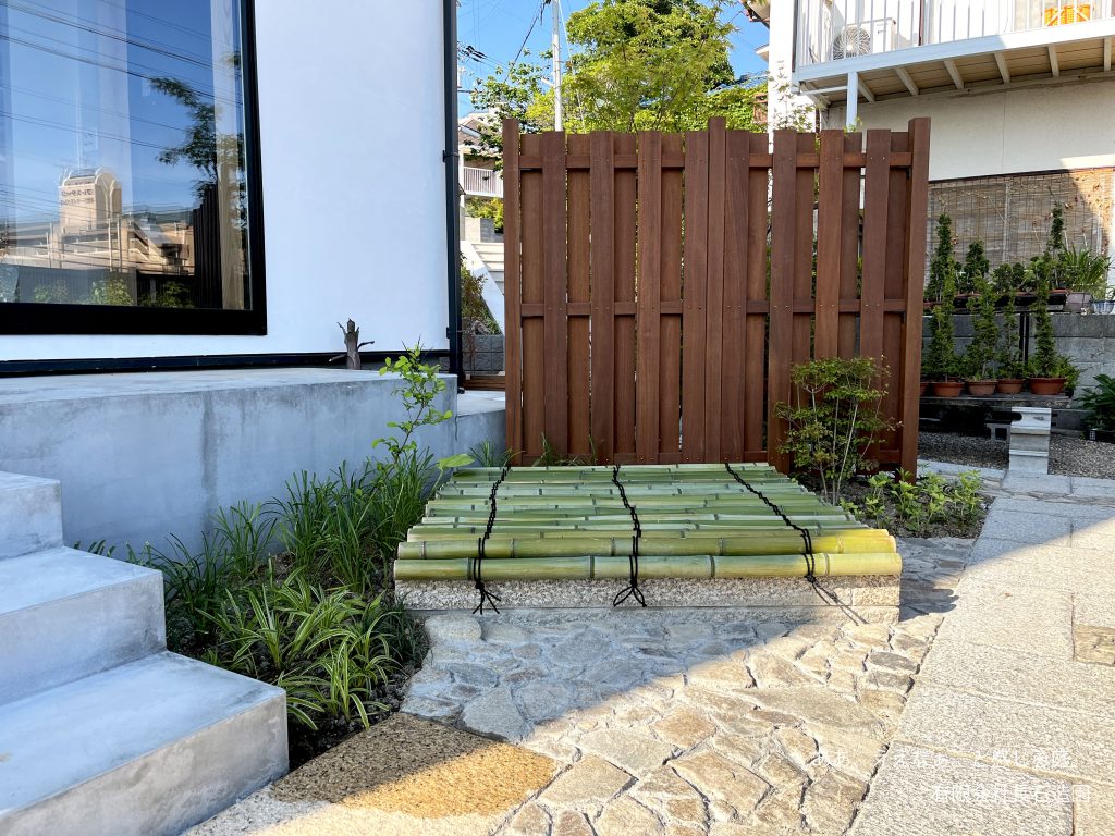 階段を降りると石の園路とウリン材で造られた板塀があります。