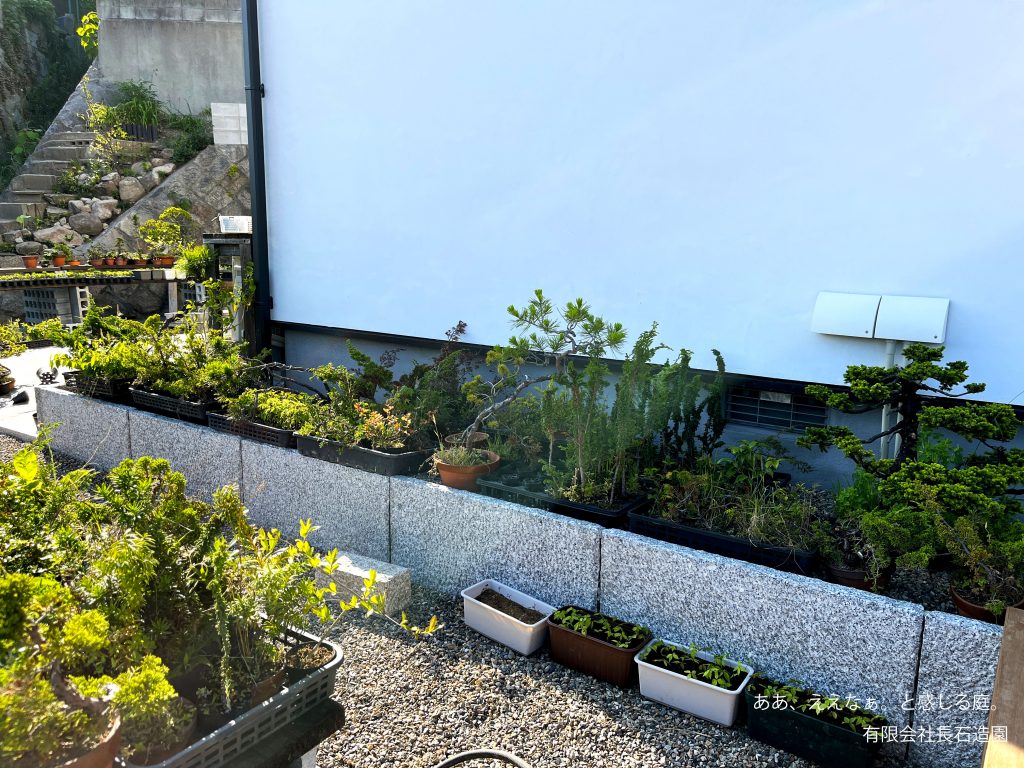 園路の左右には盆栽棚があります。こちらは施主様の方で材料支給があったり、昔から使われていたものだったりの物を使用し飾られています。