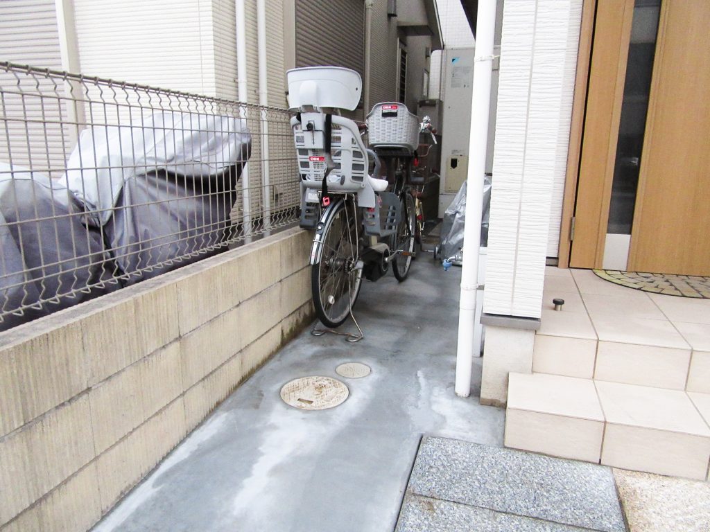 自転車置き場アプローチの横はコンクリートで仕上げ、自転車置き場をつくりました。