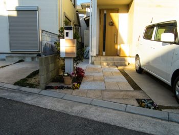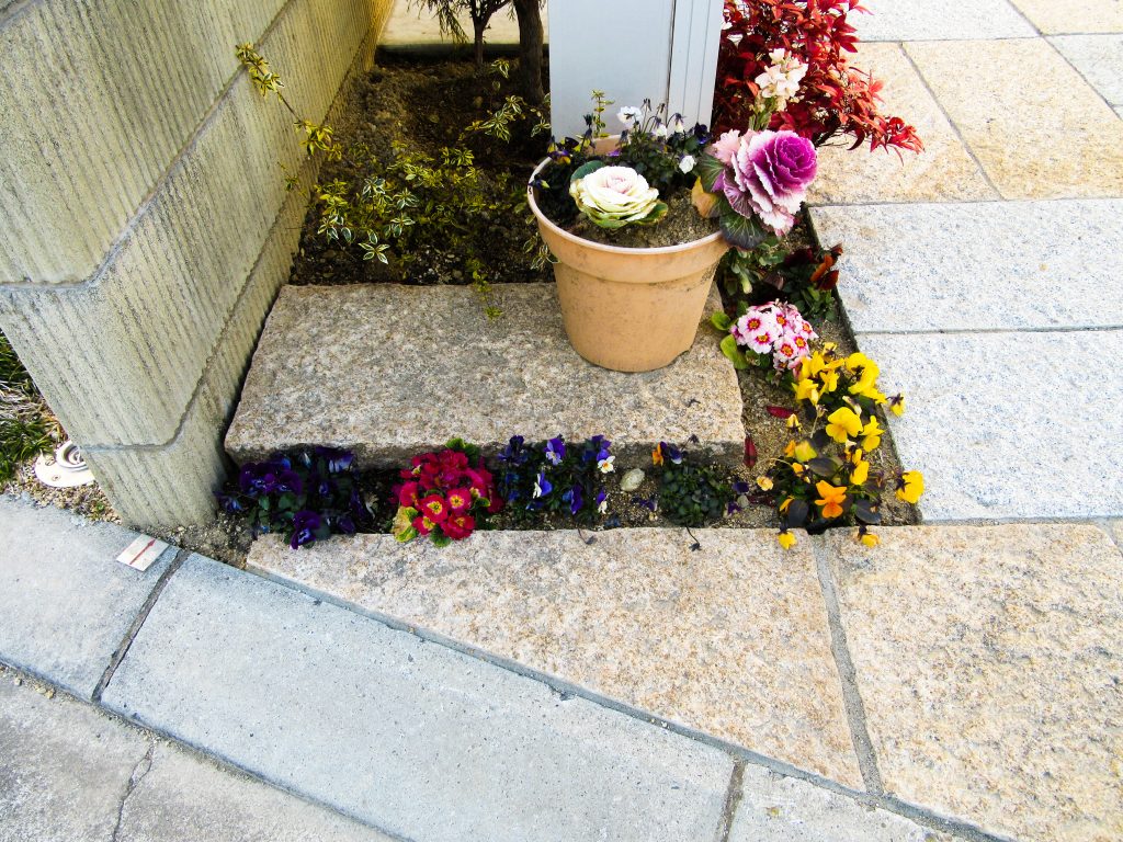 花壇門柱まわりの花壇を取り壊し、アプローチの縁をつかい花壇として活用しています。